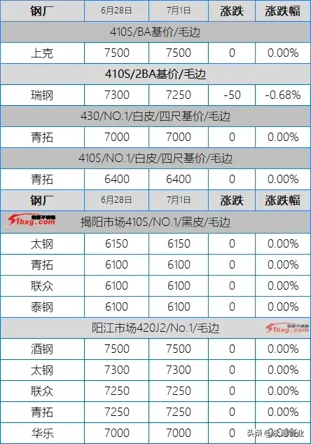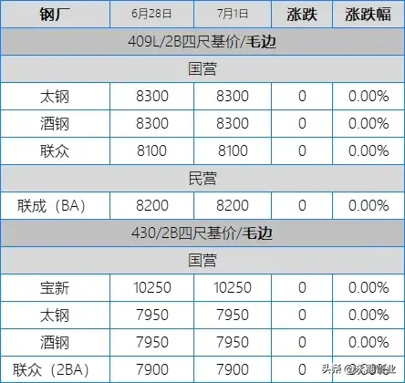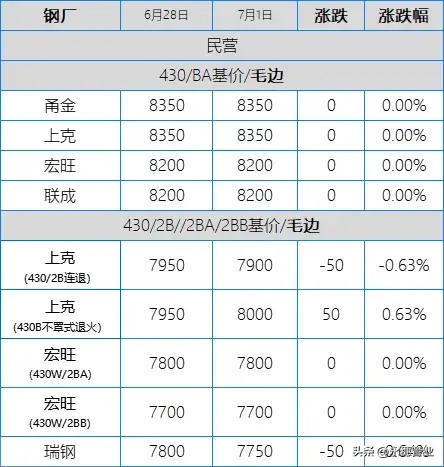 目前市场主流报价:410S热轧黑皮在6100-6150元/吨;430热轧黑皮在6700-6800元/吨;太钢/酒钢430/2B(毛)在7950-8000元/吨;联众430/2BA(毛)在7850元/吨左右;宏旺430/2BA(毛)在7750-7800元/吨;甬金430/BA(毛)在8350元/吨左右;上克430/BA(毛)在8350元/吨左右;宏旺430/BA(毛)在8150-8200元/吨;瑞钢430/2BA(毛)在7700-7750元/吨,其中期货价在7800元/吨左右;联成430/BA(毛)在8200元/吨左右。